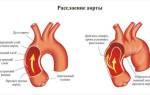 При ярковыраженном атеросклеротическом процессе на месте образования бляшки или неровности, при колебаниях давления стенка аорты может расслоиться. Расслоение стенки аорты, или расслаивающаяся аневризма аорты — редкое, но очень тяжелое заболевание. Лечится только хирургическим вмешательством, иногда безуспешно.